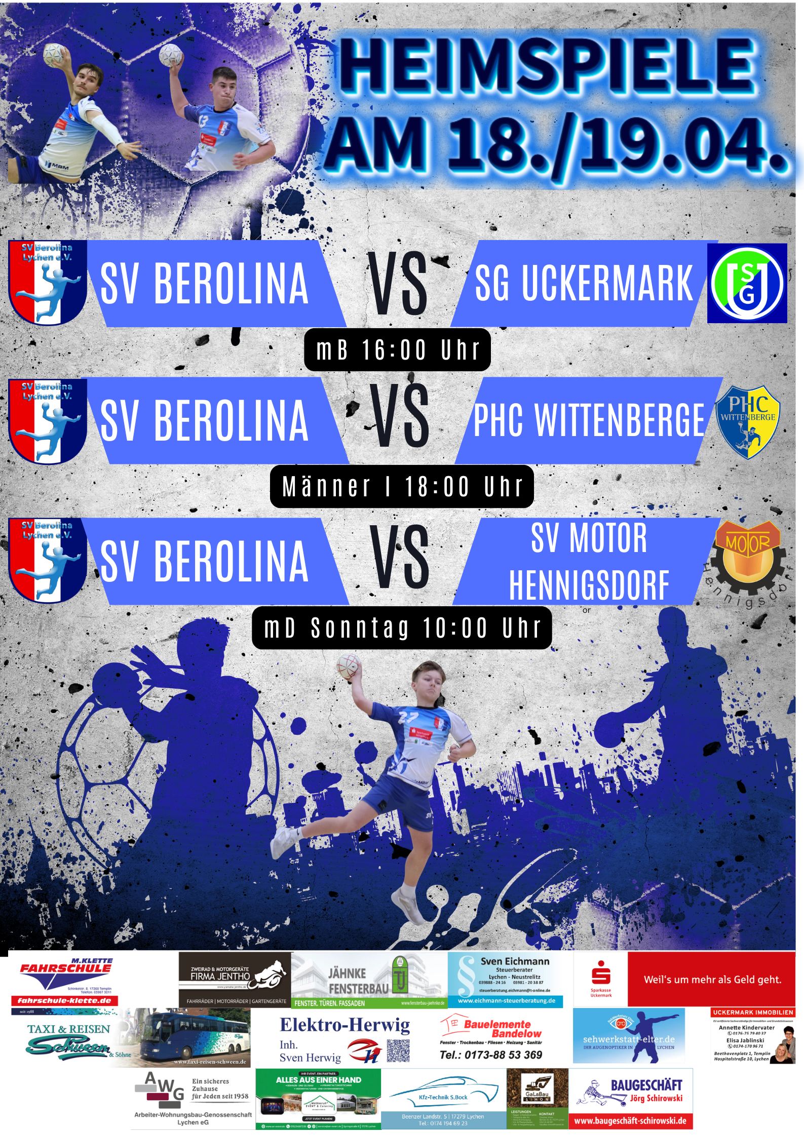 AUSWÄRTSSPIELE AM 18.04.: 10:00 Uhr: wE: SV Stahl Finow - SV Berolina / 13:00 Uhr: Ü40: SV Eichstädt 1949 - SV Berolina / 14:00 Uhr: Frauen: SG Uckermark II - SV Berolina / 16:00 Uhr: mC: HSV Oberhavel - SV Berolina /AUSWÄRTSSPIELE AM 19.04.: 10:00 Uhr: mE: Oranienburger HC II - SV Berolina / 12:00 Uhr: wB: FK Hansa Wittstock 1919 - SV Berolina