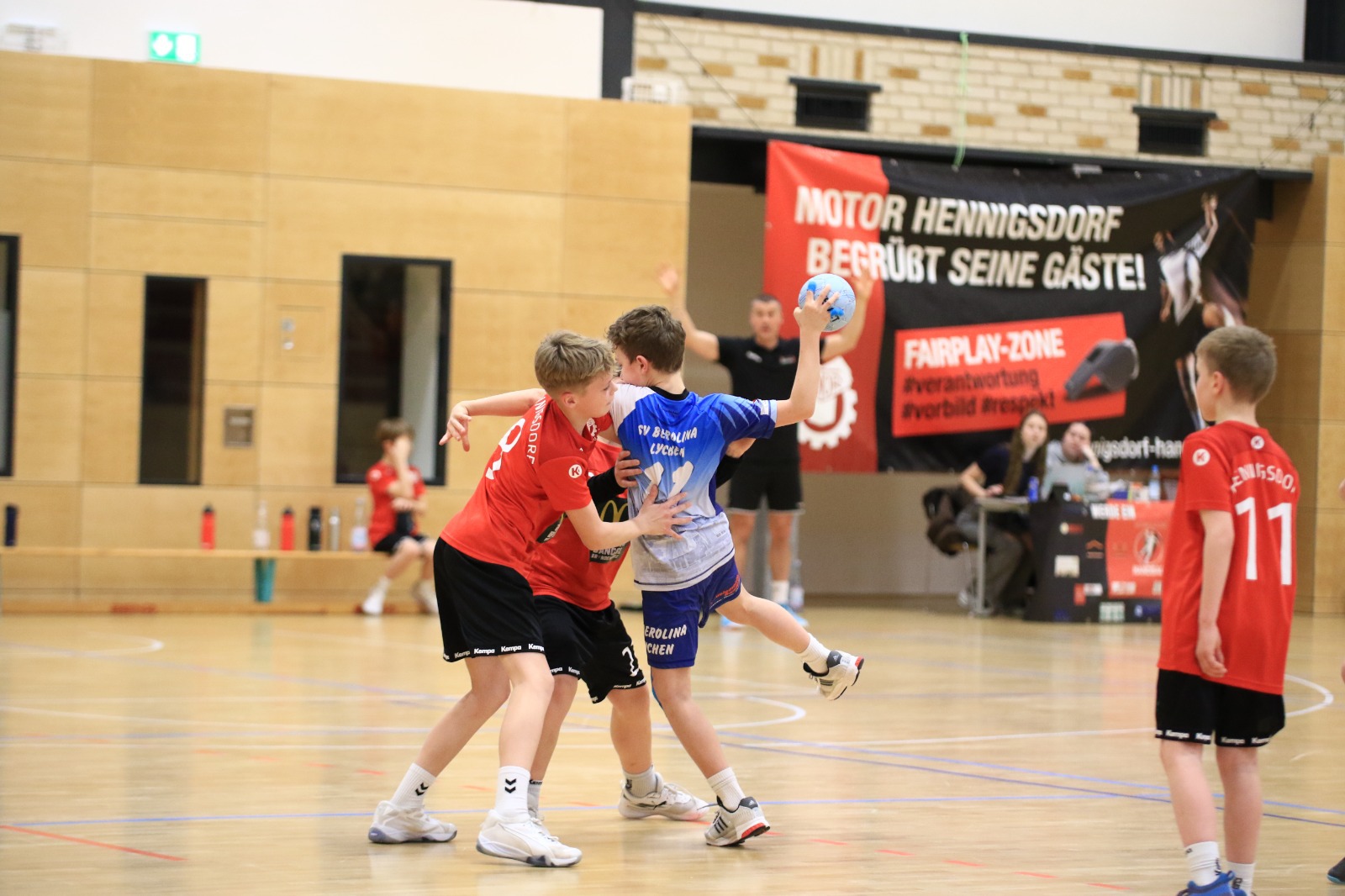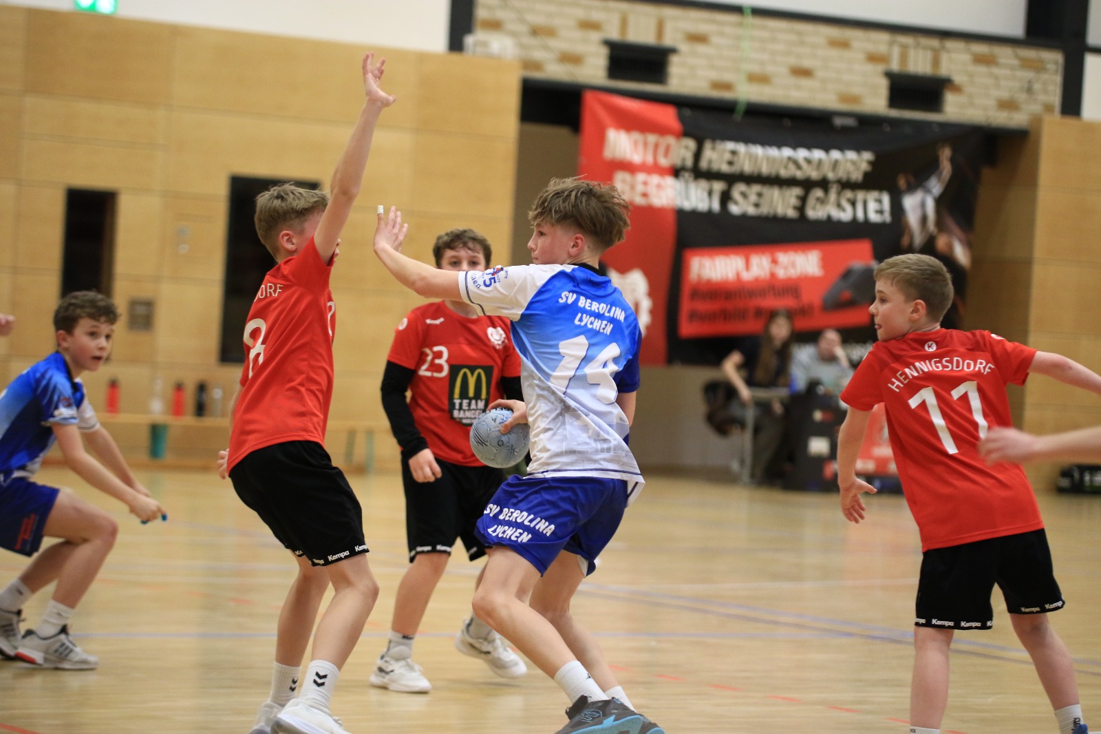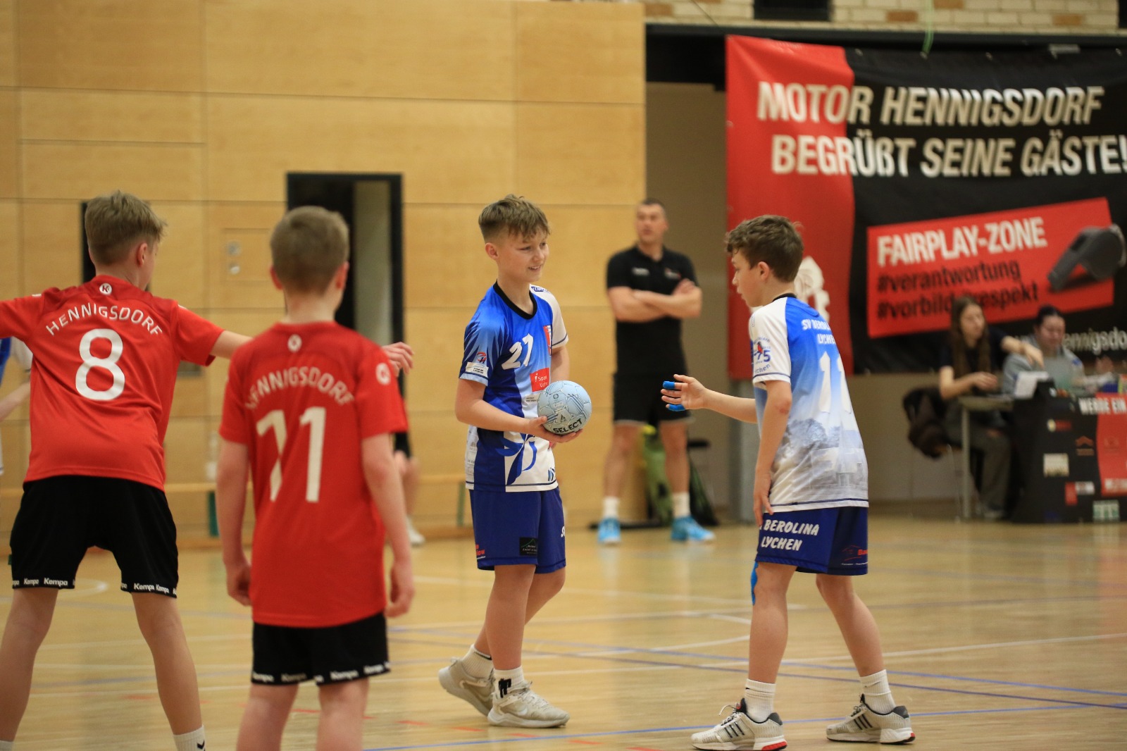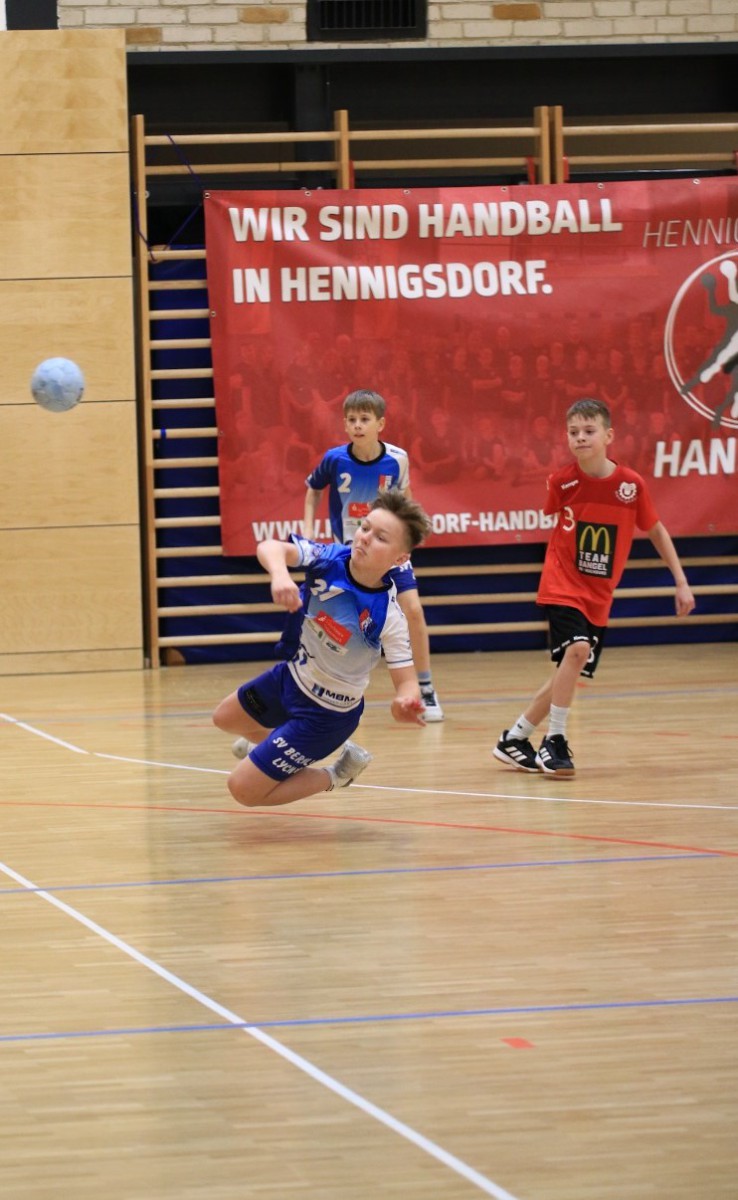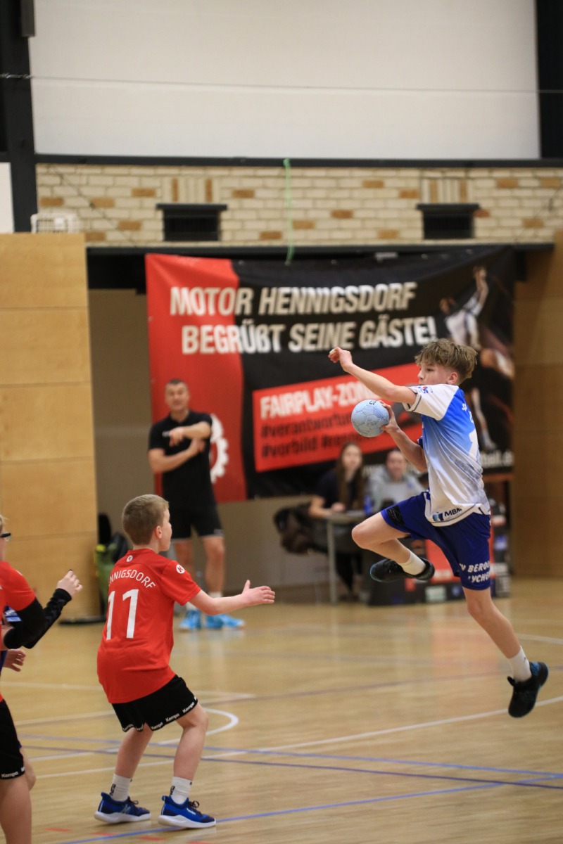 Die Jungen der D-Jugend (1./16:0) reisten zum Spitzenspiel zum SV Motor Hennigsdorf (2./12:2). Schnell zeigte sich, dass das Spiel gegen körperlich etwas unterlegene Gastgeber keine enge Partie werden würde. Nach gut sechs Spielminuten hieß es 1:7, in die Pause ging es beim 8:16.Kevin Heise zeigte eine Torhüterleistung auf hohem Niveau und reihte sich damit in eine sehr gute Mannschaftsleistung ein. Nur in der Abwehr gelang es nicht immer, sich auf das starke und flinke 1 gegen 1 des Gegners einzustellen. Der Überlegenheit tat dies allerdings keinen Abbruch. Alle Spieler waren in das gute Angriffsspiel eingebunden, wenn auch Johnny Foltis (12) und Ben Brosinski (11) einmal mehr die mit Abstand besten Werfer waren. Berolina gewann schließlich deutlich mit 32:17.