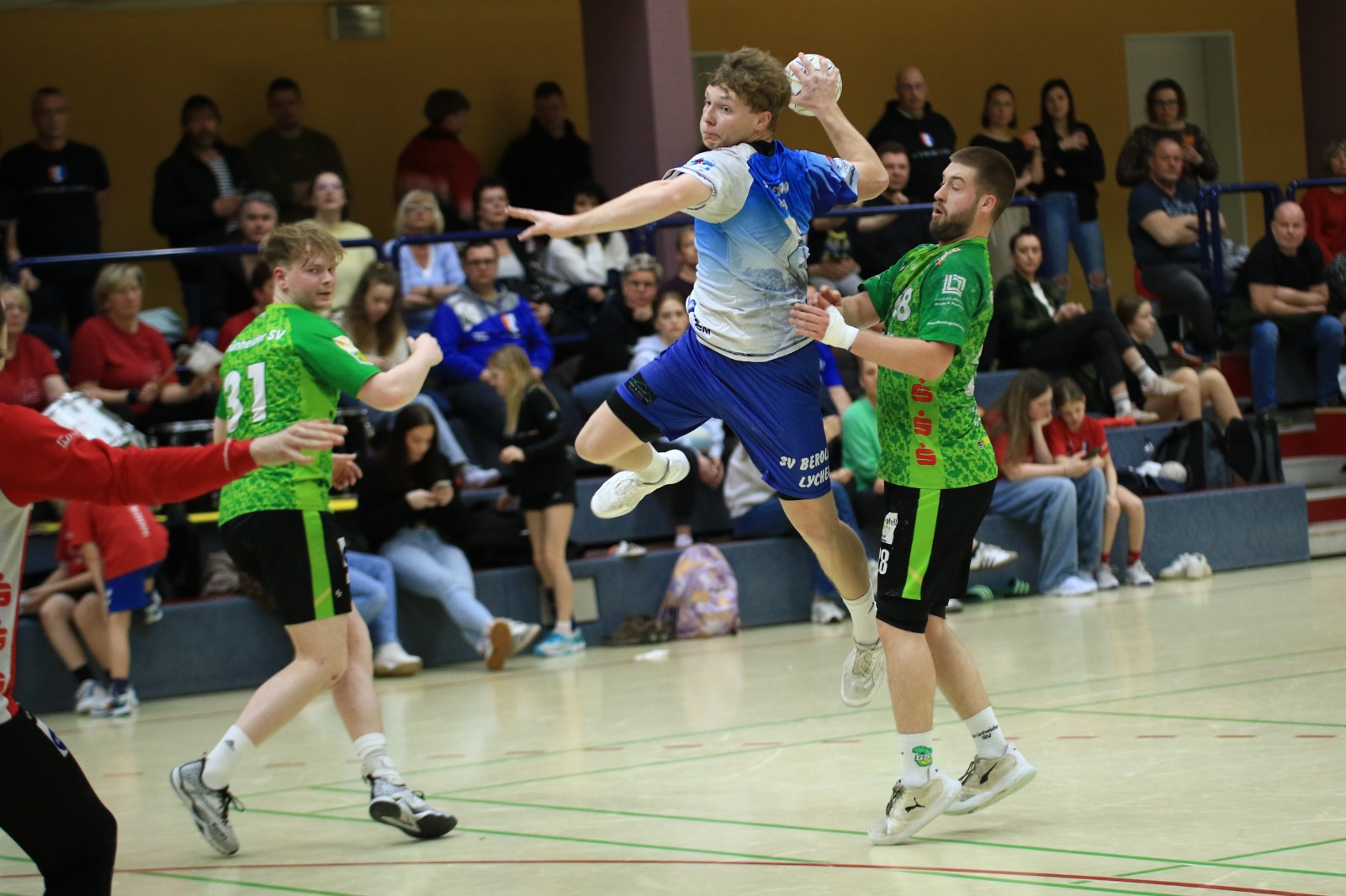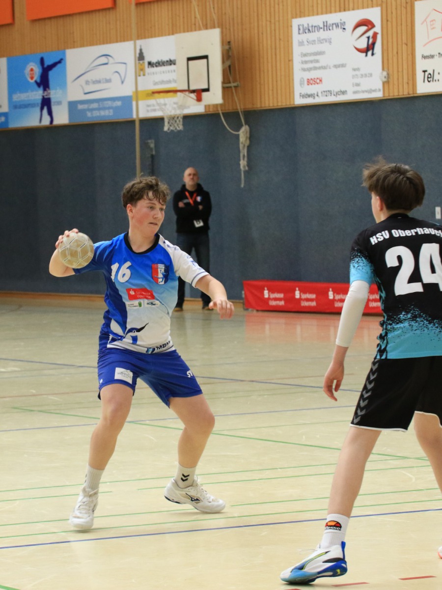 Im Spitzenspiel der männlichen C-Jugend (2./16:2) galt vor dem Spiel eher der noch ungeschlagene Gegner vom HSV Oberhavel (1./20:0) als Favorit. Die Gastgeber zeigten dann aber von beginn an eine starke spielerische Leistung und traten in den ersten fünfzehn Minuten der Partie mutig und konzentriert auf. Dies zeigte sich auch im Ergebnis, denn Berolina lag zu diesem Zeitpunkt mit 12:4 in Führung. Auch als es mit 16.10 in die Pause ging, lag Lychen noch deutlich vorn.