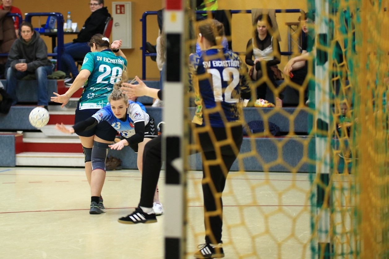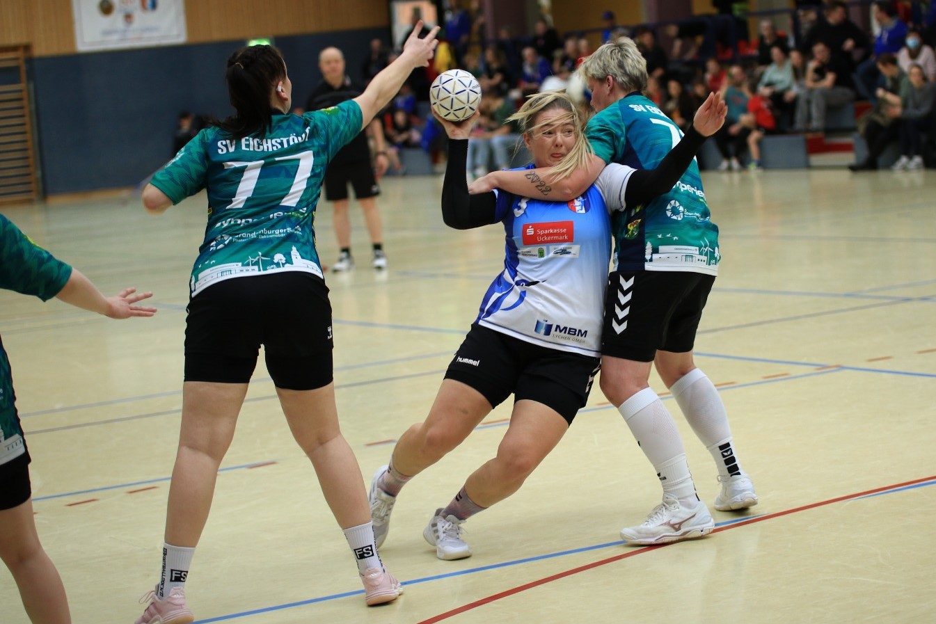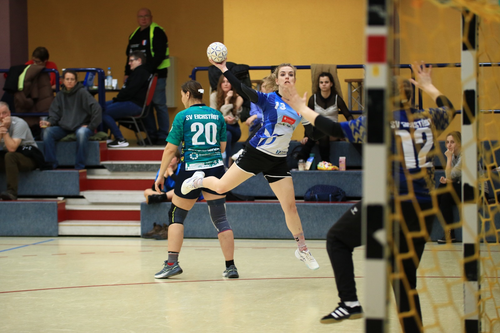 Nach etwas mehr als viereinhalb Minuten lag Berolina mit 4:0 in Führung. Nachdem sich Lea Malchow dann ohne gegnerische Einwirkung verletzte, gab es zunächst einen Bruch im Spiel der Gastgeberinnen. Eichstädt konnte mehrfach ausgleichen und beim 6:7 in der 16. Minute selbst die Führung übernehmen. Berolina kämpfte sich aber trotz zahlreicher Fehler wieder ins Spiel und lag zur Pause mit 14:10 in Front. Großen Anteil daran hatte Weeda Schmidt im Tor, die zahlreiche Torchancen der Gäste zunichtemachen konnte.