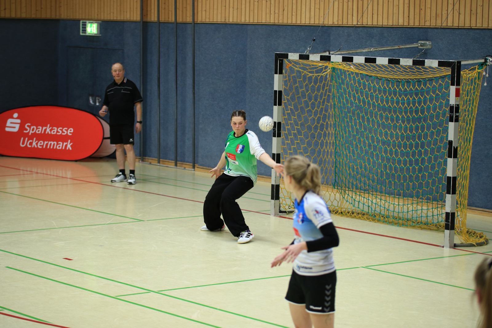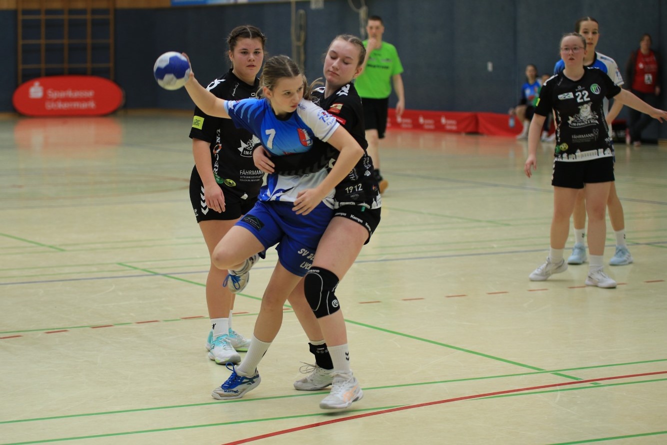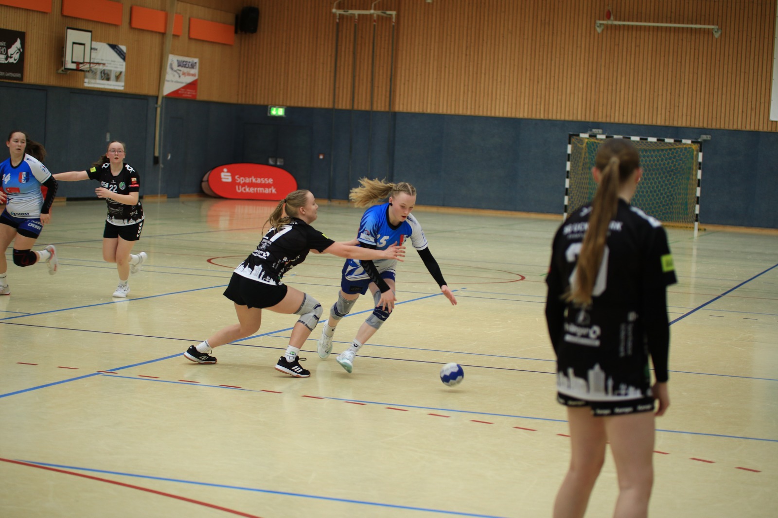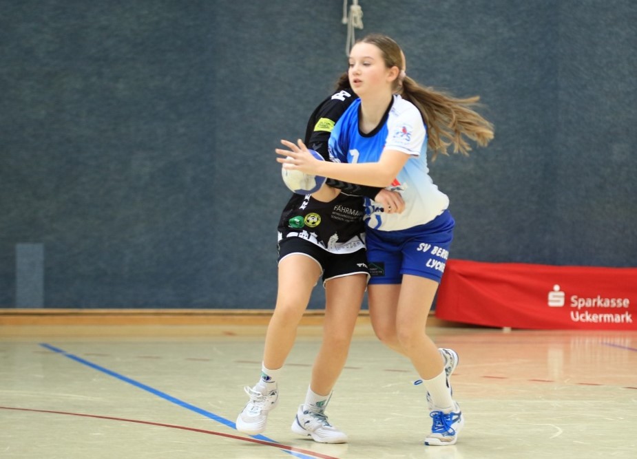 Den Anfang machten die Mädchen der C-Jugend (3./7:3 Punkte), die mit der Mannschaft von der SG Uckermark (1./12:2) den Spitzenreiter zu Gast hatten. Da krankheitsbedingt zahlreiche Ausfälle zu beklagen waren, halfen Lenerike Genschow und Martha Klemm, die sonst in der B-Jugend aktiv sind aus. Dass sich die Mannschaft erst an die ungewohnte Aufstellung gewöhnen mussten, war vor allem in der ersten Hälfte dann unübersehbar. Berolina ging zwar in Führung, musste in der 12. Minute dann aber zunächst beim 4:5 eine Gästeführung hinnehmen. Danach eroberten sich die Gastgeberinnen die Führung aber zurück und gaben sie dann über das gesamte Spiel hinweg nicht mehr ab. Beim Szand von 12:10 ging es in die Pause. In der zweiten Hälfte zeigte sich dann sowohl offensiv wie defensiv eine starke Teamarbeit, die den Vorsprung schnell größer werden ließ. Immer wieder gab es sehenswerte Spielzüge. Die Torhüterinnen Johanna Haase und Merle Lubitz unterstützen die Abwehr mit zahlreichen Paraden. Am Ende setzte sich Berolina klar mit 31:23 durch. Nele Weiss (8 Tore), Luna Bock und Lenerike Genschow (je 7) trafen dabei am häufigsten.