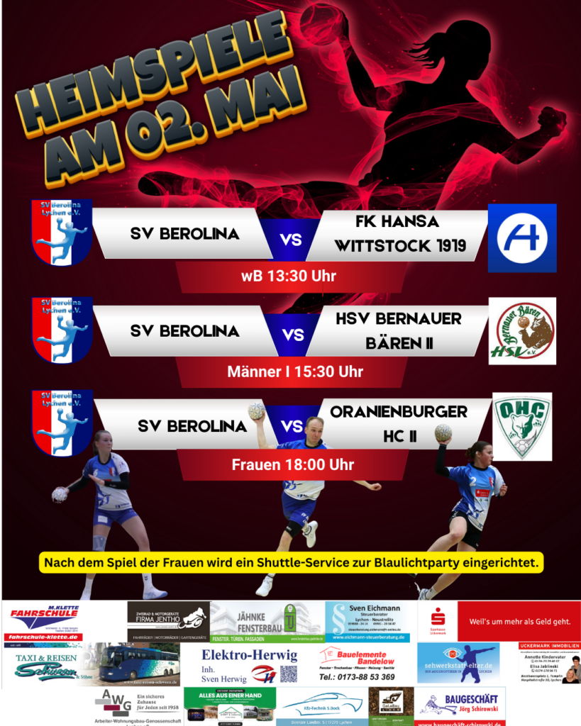 Spiele vom 25. und 26.04. : Männer I: FK Hansa Wittstock 1919 - SV Berolina 22:26 / mE: SV Berolina - Templiner SV Lok 1951 50:15 / mC: SV Berolina - SV Motor Hennigsdorf 34:28 / wB: SV Berolina - SG Uckermark 31:29 / Frauen: SV Berolina - TSG Liebenwalde 30:33